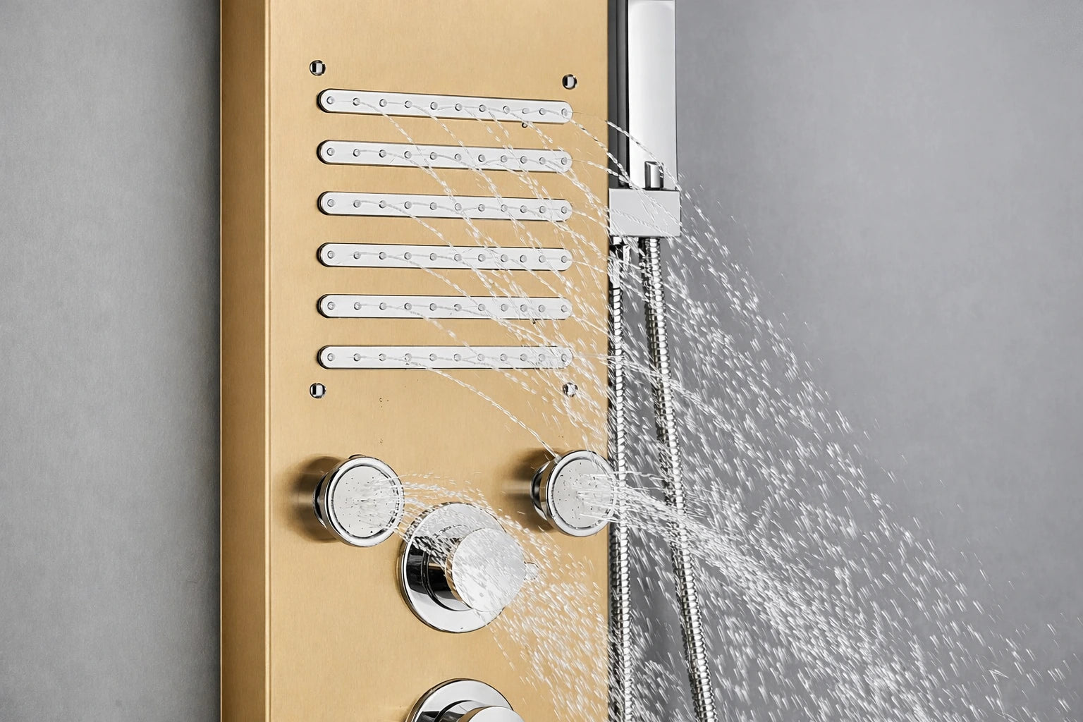 - L'hydromassage (selon modèle) :Sur la douchette : Un jet concentré et pulsé pour détendre les cervicales.Sur les colonnes "Panneau" : Des buses latérales projettent l'eau horizontalement pour masser le dos.