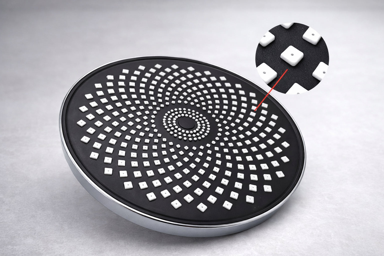 Les têtes de douche sont équipées de picots en silicone souple. Le calcaire ne peut pas s'y incruster "en dur". Si vous remarquez une baisse de débit ou un dépôt blanc, il suffit de frotter les picots avec le pouce (même sous la douche) pour briser le tartre et l'expulser immédiatement. - Pour l'esthétique (la vérité sur les couleurs) :