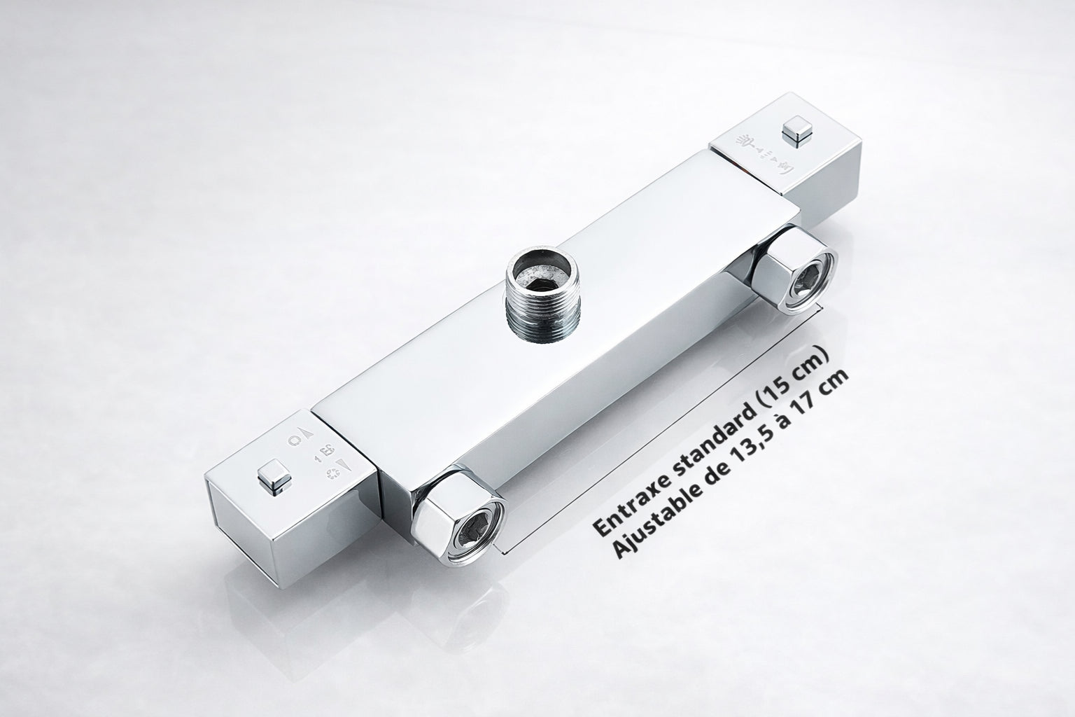 - La colonne thermostatique (Le confort moderne) : C'est la technologie intelligente. Vous choisissez votre température idéale (par exemple 38°C) et la colonne s'occupe de tout. Grâce à sa cartouche active, elle compense instantanément les variations de débit. L'eau reste toujours à la température choisie, au degré près, même si d'autres robinets sont ouverts.Le + Sécurité : Les modèles thermostatiques sont équipés d'une butée de sécurité à 38°C, idéale pour éviter tout risque de brûlure accidentelle, surtout pour les enfants.